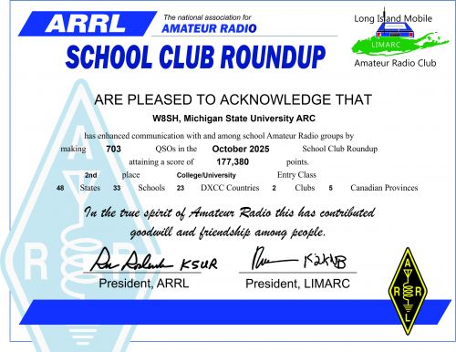 Additionally, the ARRL School Club Roundup results from October 2025 are in and W8SH was: